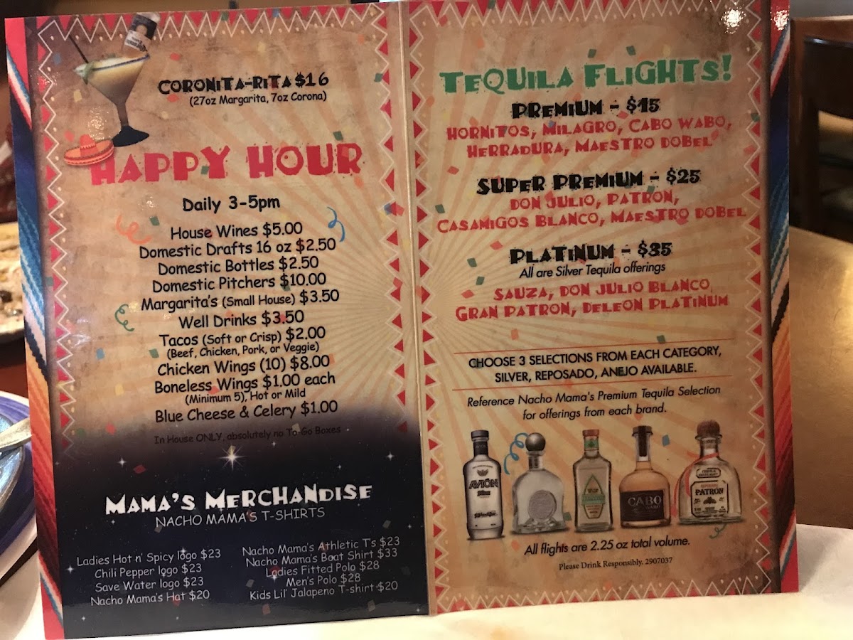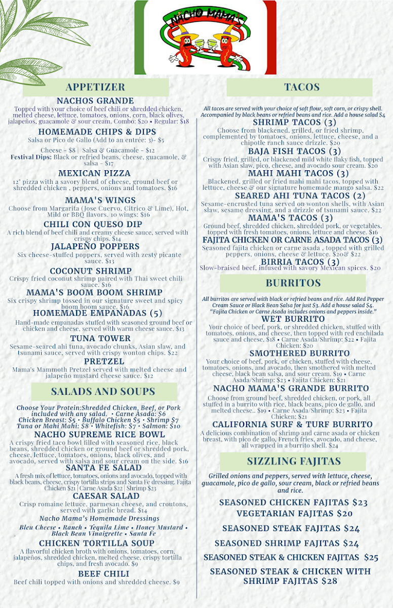 Appetizer Salads And Soups Tacos Burritos Sizzling Fajitas Tex Mex Entrees Enchiladas Dessert Sandwiches & Wraps Quesadillas Little Jalapenos American Fare Ca La Carte Items Extras Nacho Mama's Shots Tequila Flights Taco Tuesday Nacho Mamas World Famous Margaritas 800z Pitchers Of Argaritas Nacho Mama Mojitos Specialty Cocktails Draft Beers Domestic Import Others