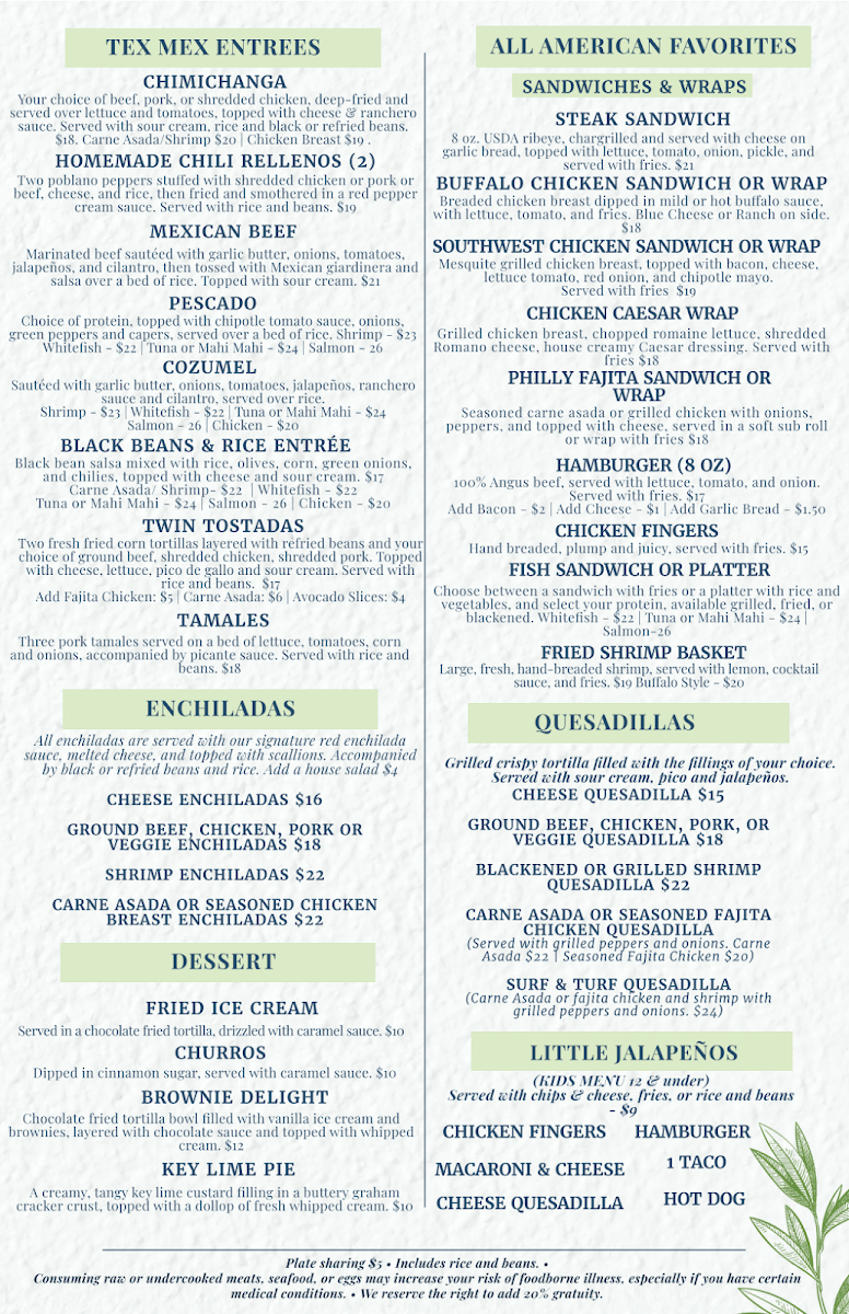 - Tex Mex Entrees: Indulge in the mouthwatering Homemade Chili Rellenos or savor the flavorful Pescado at an approachable price.